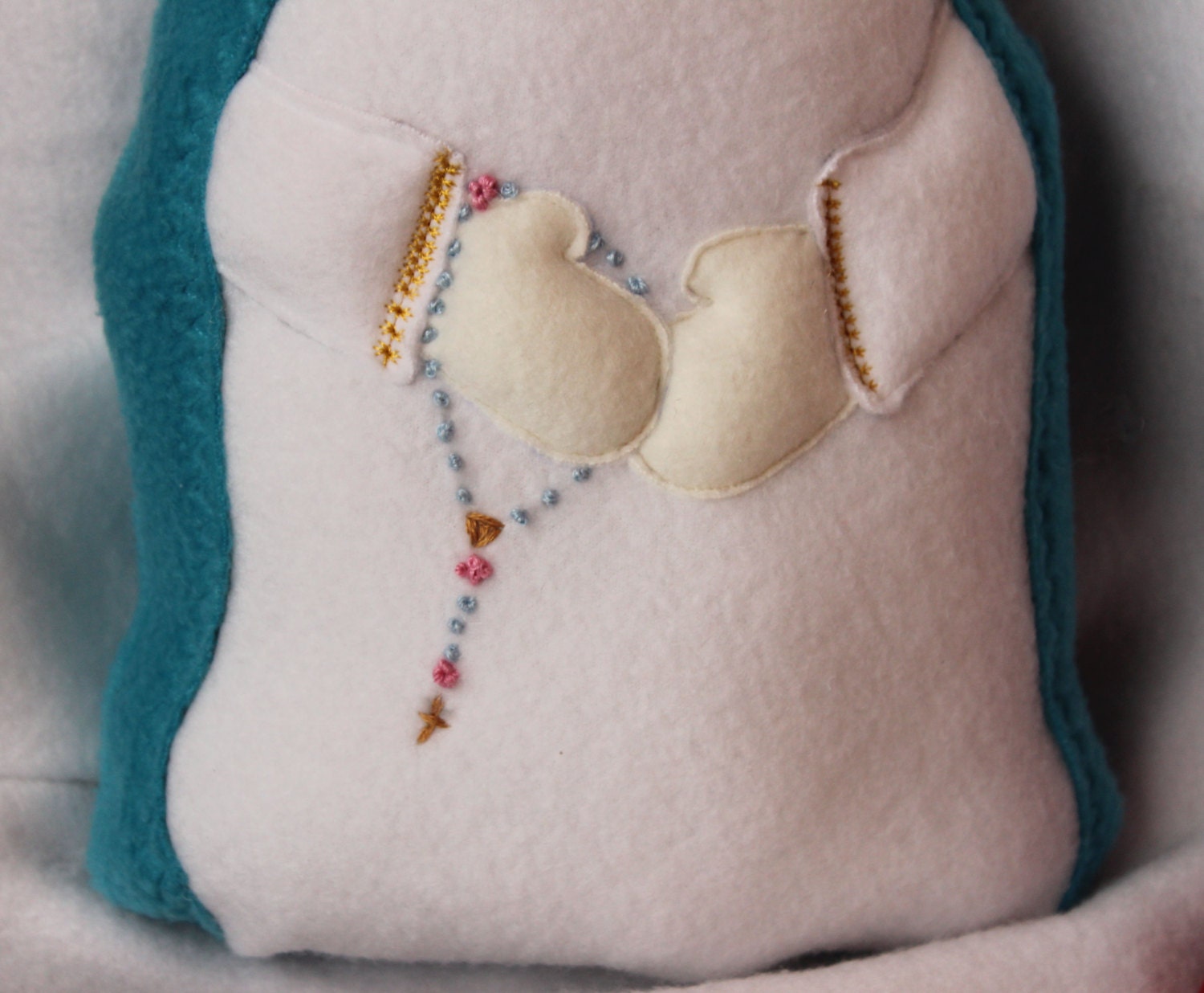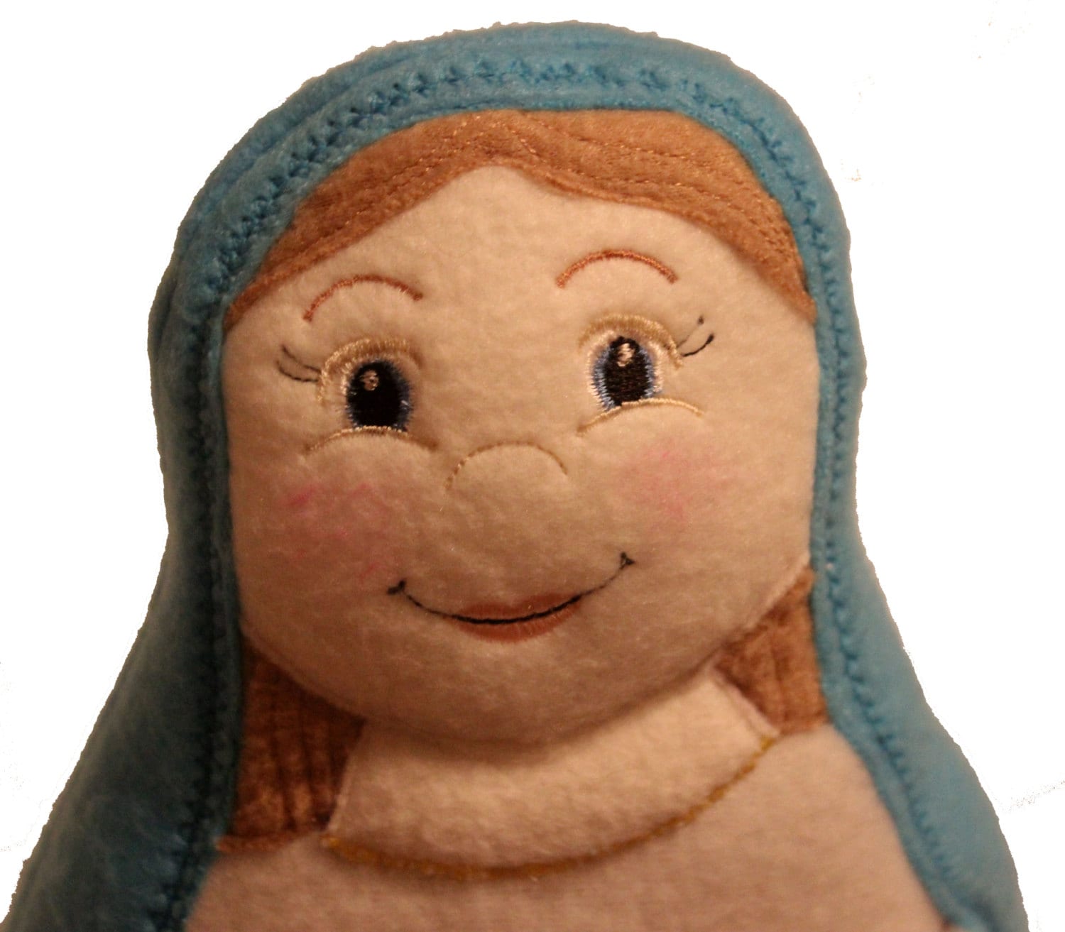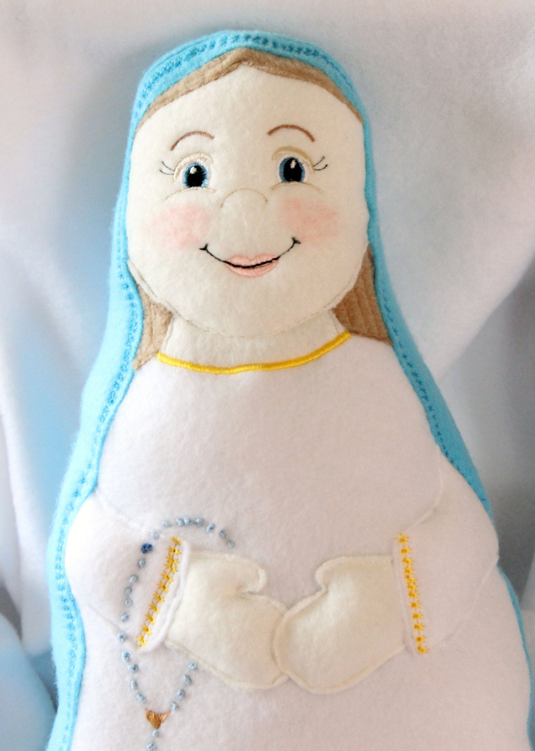 Our Lady of the Rosary Handmade Soft Saint Doll. Each doll is approximately 14" tall made with soft fleece, making it perfect for your little ones to cuddle up with. Dolls are embroidered with a sweet friendly face your child will love and a hand embroidered or beaded rosary. This is the perfect doll to help teach your child about the Blessed Mother and the Rosary.